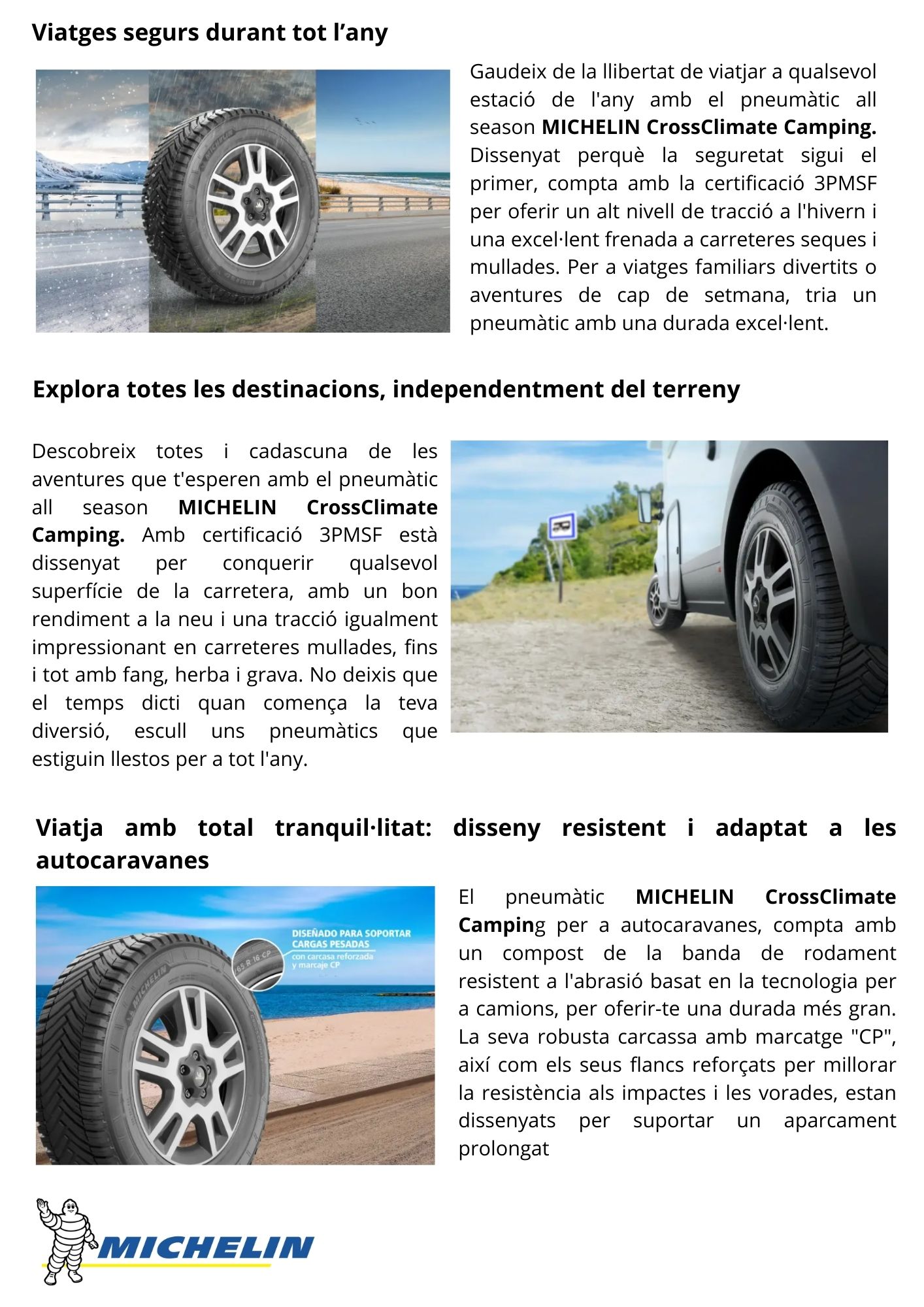Gaudeix d´aventures durant tot l´any amb l´exclusiu pneumàtic 225/70 R15CP 112/110R MICHELIN CrossClimate Camping. Pneumàtic d'altes prestacions dissenyat per oferir-te la màxima seguretat a totes les superfícies.