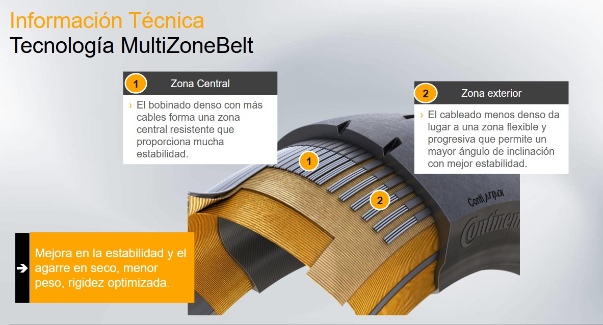 Confianza en curva gracias a una innovadora configuración de cinturón de acero que utiliza la tecnología MultiZoneBelt: La implementación de un bobinado más apretado del cinturón de acero en el centro del neumático asegura la estabilidad en recta, mientras que un bobinado más ancho en el hombro del neumático aumenta la agilidad, la huella de contacto y la confianza en extremos ángulos de inclinación.