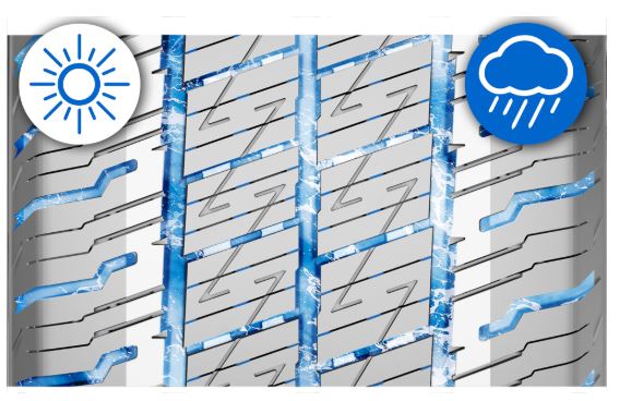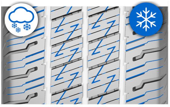 El nuevo Vanis AllSeason se caracteriza por una geometría de canales de mayor profundidad y anchura en lugar de laminillas. Su nuevo diseño de canales mejora la adherencia gracias a la fricción nieve-nieve que le proporciona un mejor rendimiento de frenada en todas las situaciones de conducción. Su rendimiento en invierno también está garantizado por la certificación 3PMSF.