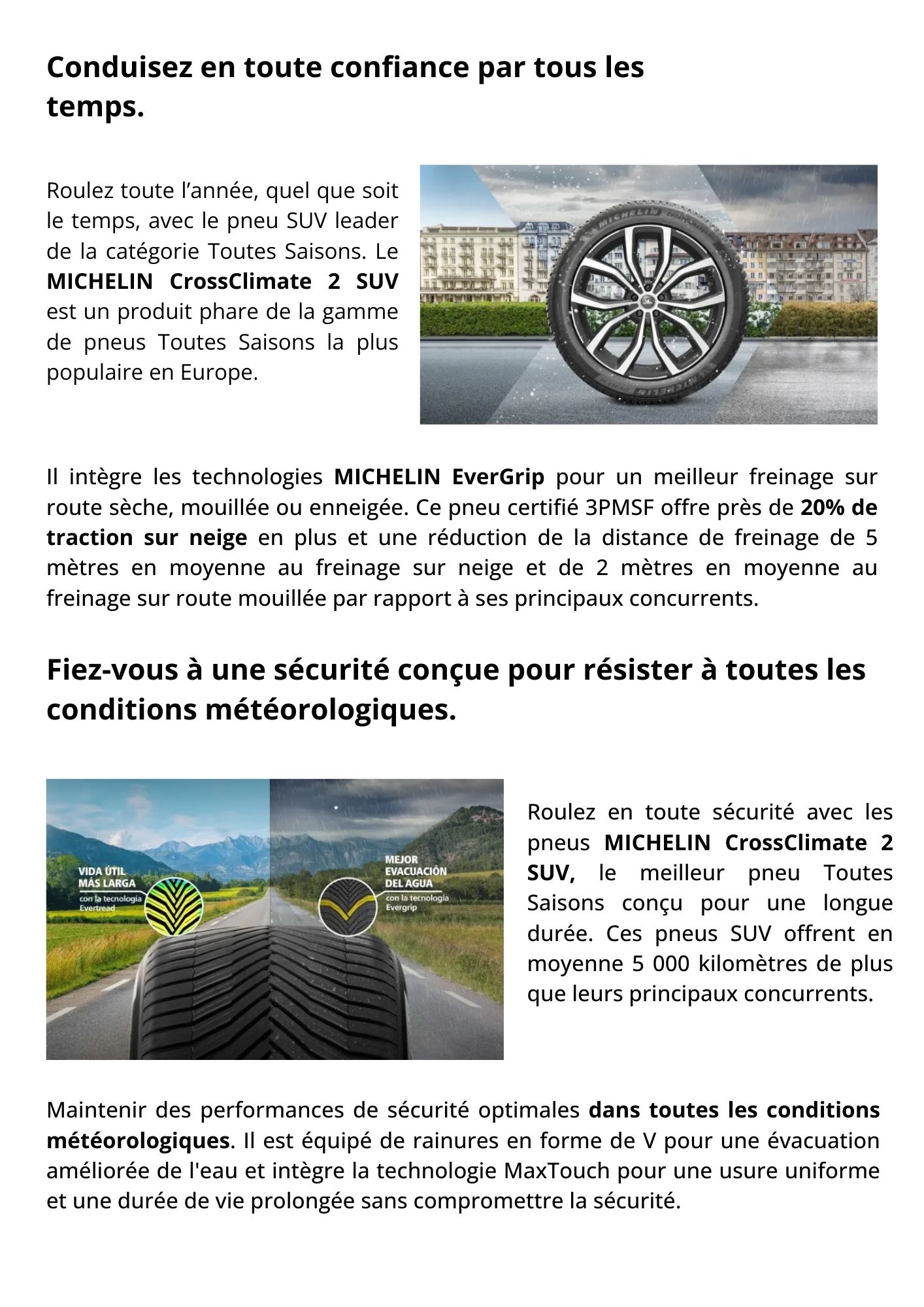 Restez en mouvement partout et par tous les temps, du premier au dernier kilomètre, avec le MICHELIN CrossClimate 2 SUV 255/40 R21 102W : le pneu SUV qui domine la catégorie All Season et fait partie de la gamme de pneus la plus vendue en Europe.