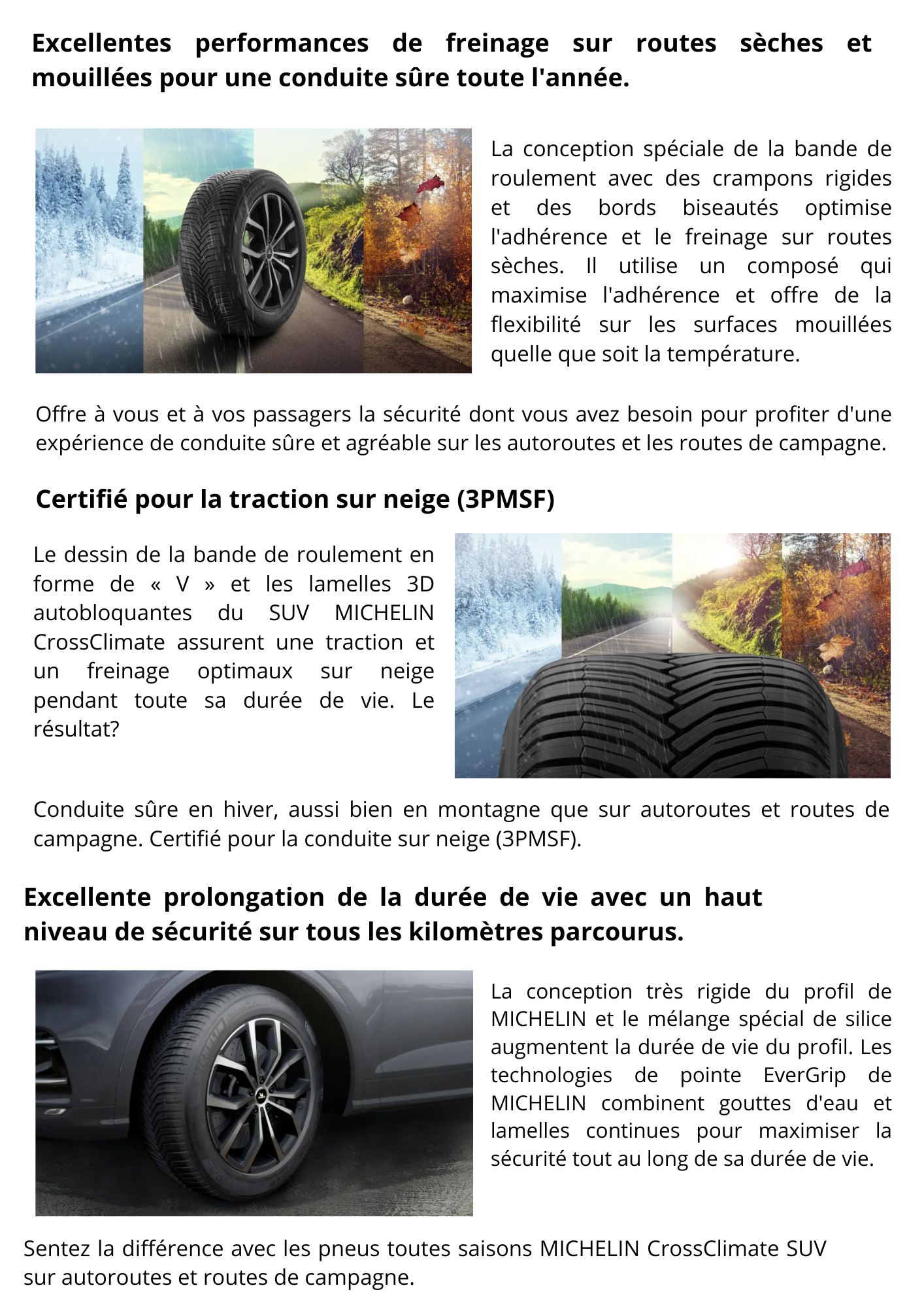 MICHELIN 225/45 R19 96W CrossClimate SUV, la versión SUV del neumático All Season más vendido en Europa, ha sido diseñado para ofrecer una seguridad duradera y un gran kilometraje en cualquier condición climática.