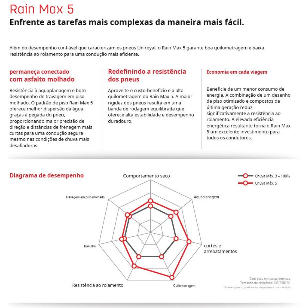 O novo Uniroyal 205/65 R15C 102/100T Rain Max 5 combina excelente desempenho em piso molhado, conforto de condução e grande quilometragem.