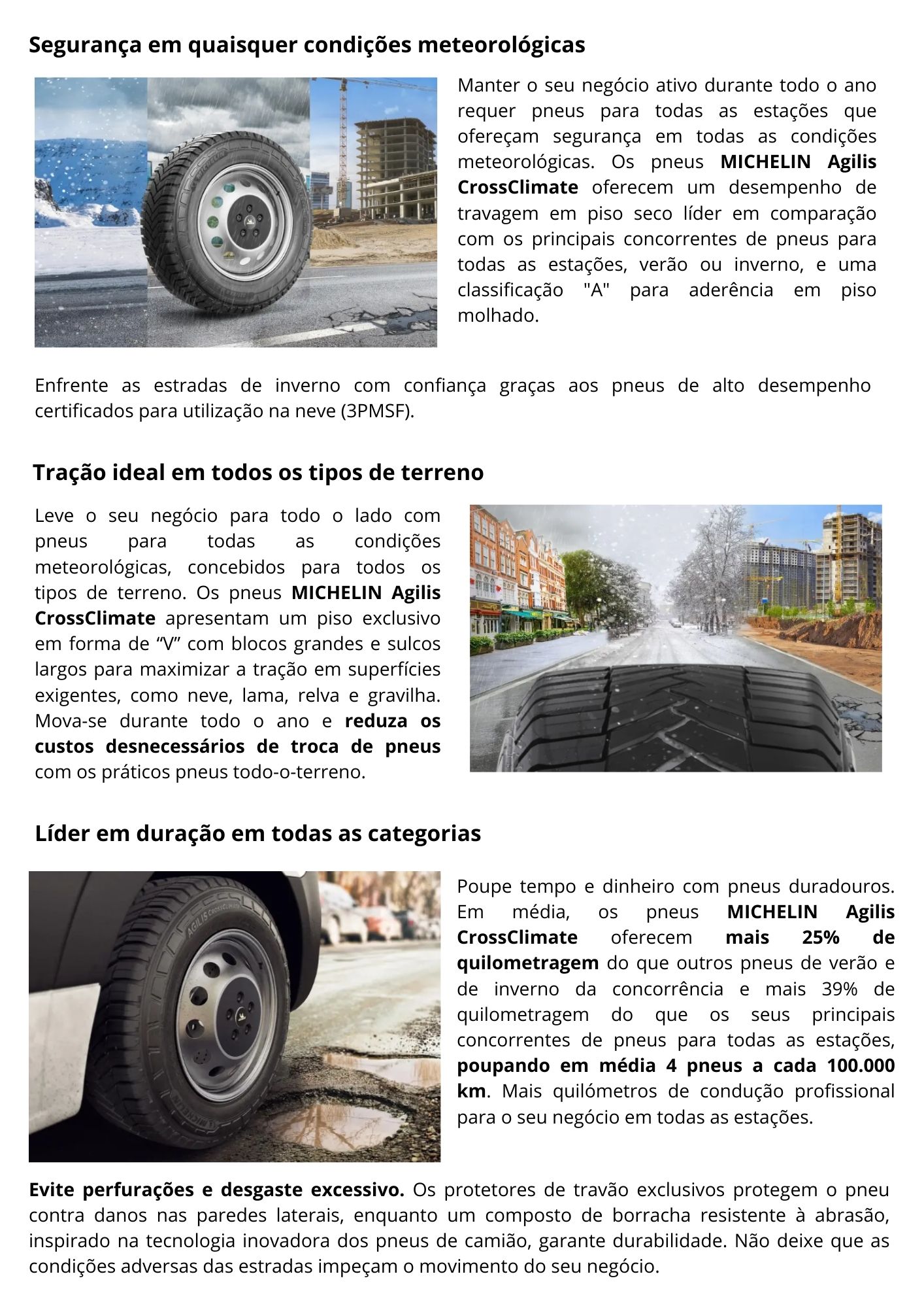 225/70 R15C 112/110R MICHELIN Agilis CrossClimate, o pneu para van projetado para oferecer segurança, durabilidade e tração totalmente confiável em qualquer condição climática.